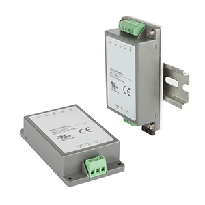 Available in two wide (4:1) input ranges for nominal 12/24VDC and 24/48VDC, the DTE06 series of encapsulated 6W DC-DC converters are chassis mount as standard or can be ordered with a DIN rail mount. They have screw terminals for ease of connection and an LED provides clear ‘power good’ indication. Remote On/Off is standard and when inhibited the standby current is just 2.5mA. Isolation is 3kVDC input/output providing excellent separation between supply and load. The modules are fully protected against input undervoltage, short circuit and overload conditions. These features, along with a rugged design and wide operating temperature range make the DTE06 series suitable for a variety of commercial and industrial applications. -