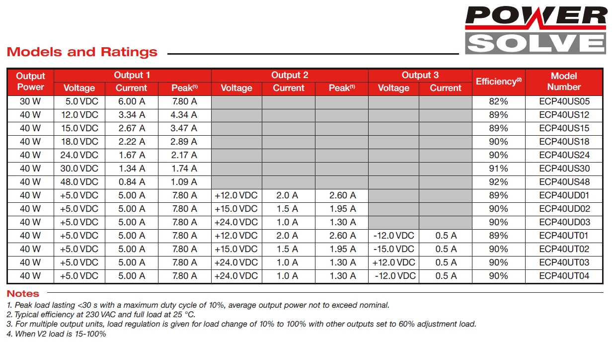 Products AC to DC Converters Low to Medium Power Switch Mode Power Supplies Open PCB versions from 5 watts to 350 watts ECP40 Series Features Low Profile Design Ultra Compact Size from 3”x 2”x 0.9” IT & Medical Approvals Single, Dual and Triple Output <0.3 W No Load Input Power Peak Load Capability 3 Year Warranty PDF Please write down your comment on this product, and click Add to Inquiry List for inquiry Add to Inquiry List Review Inquiry List Back
