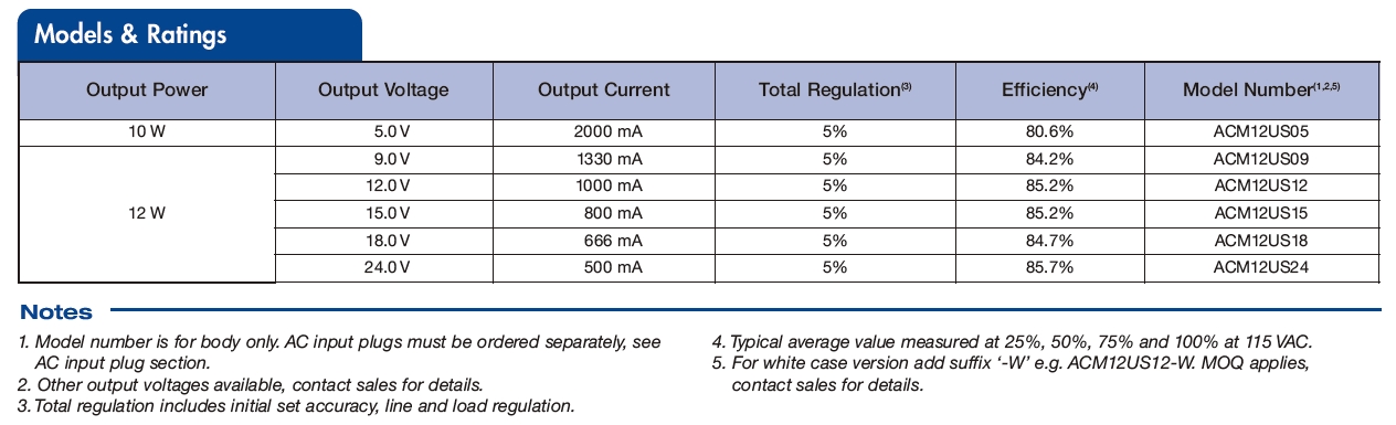 Products External Power Adaptors Plug top power adaptors ACM12 Series Features Energy Efficiency Level VI European CoC Tier 2 Medical and ITE Approvals Interchangeable Mains Connectors Optional White Versions Output Voltages from 5 V to 24 V Class II Construction 3 Years Warranty The ACM12 series of wall plug adaptors comply with the latest energy efficiency level VI standards with high active mode efficiency and extremely low no load power consumption. Available with a standard jack plug connector these adaptors suit a wide variety of cost sensitive industrial and medical applications while maintaining industry leading performance. PDF Please write down your comment on this product, and click Add to Inquiry List for inquiry Add to Inquiry List Review Inquiry List Back