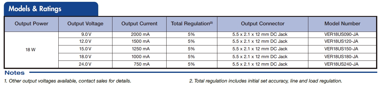 Products External Power Adaptors Plug top power adaptors VER18 Series Features Energy Efficiency Level VI European CoC Tier 2 Interchangeable Mains Connectors Included Universal Input Output Voltages from 9 V to 24 V Class II Construction Low Cost The VER18 series of wall plug adaptors comply with the very latest energy efficiency VI standards with high active mode efficiency and extremely low no load power consumption. Available with a standard jack plug connector these adaptors suit a wide variety of cost sensitive applications while maintaining industry leading performance. PDF Please write down your comment on this product, and click Add to Inquiry List for inquiry Add to Inquiry List Review Inquiry List Back