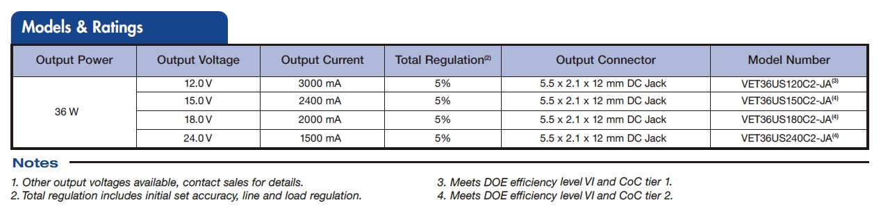 Products External Power Adaptors Desktop power adaptors VET36 Series Features Energy Efficiency Level VI European CoC Tier 2 Universal Input Output Voltages from 12 V to 24 V Class II Construction Low Cost The VET36 series of desk-top power supplies comply with the very latest energy efficiency level VI standards with high active mode efficiency and extremely low no load power consumption. Available with a standard jack plug connector these adaptors suit a wide variety of cost sensitive applications while maintaining industry leading performance. PDF Please write down your comment on this product, and click Add to Inquiry List for inquiry Add to Inquiry List Review Inquiry List Back