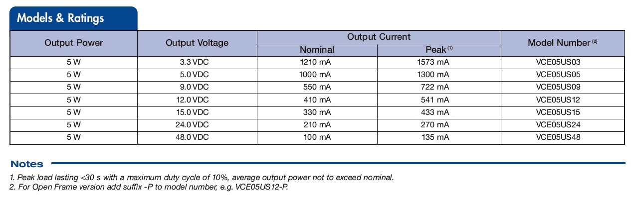 Products AC to DC Converters Plastic Encapsulated Power Supplies VCE05 Series Features Compact Size Single Outputs from 3.3 to 48VDC Open Frame & Encapsulated PCB Mount <0.3W No Load Input Power Peak Load Capability No External Components Required Class II Low Cost 3 Year Warranty The VCE05 is a series of open frame and encapsulated AC-DC single output power suppliesdesigned for low cost ITE and Industrial applications. The series provides two mechanical optionsincluding open frame and encapsulated PCB mount. With approvals to world-wide safetystandards, compliance with class B for conducted and radiated emissions and a 130%, 30s peakload capability, these class II isolation parts benefit system designers with easy integration into awide range of applications. PDF Please write down your comment on this product, and click Add to Inquiry List for inquiry Add to Inquiry List Review Inquiry List Back