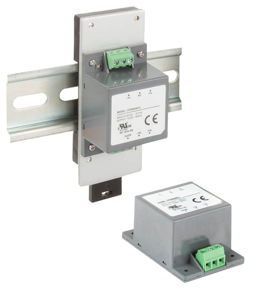 Products DC to DC Converters and Switching Regulators DC-DC Converters Chassis mounting DTE06 Series Features Regulated single & dual outputs from 5VDC to 48VDC Wide 4:1 input range Fully encapsulated chassis mount Optional DIN rail version IEC/UL/cUL62368-1 safety approvals EN55032 class A with no external components Remote on/off 3kVDC isolation -40°C to +105°C operating temperature Full power to 80°C MTBF >4Mhrs (MIL-DHBK-27F, +25°C GB) 3 year warranty Available in two wide (4:1) input ranges for nominal 12/24VDC and 24/48VDC, the DTE06 series of encapsulated 6W DC-DC converters are chassis mount as standard or can be ordered with a DIN rail mount. They have screw terminals for ease of connection and an LED provides clear ‘power good’ indication. Remote On/Off is standard and when inhibited the standby current is just 2.5mA. Isolation is 3kVDC input/output providing excellent separation between supply and load. The modules are fully protected against input undervoltage, short circuit and overload conditions. These features, along with a rugged design and wide operating temperature range make the DTE06 series suitable for a variety of commercial and industrial applications. PDF Please write down your comment on this product, and click Add to Inquiry List for inquiry Add to Inquiry List Review Inquiry List Back