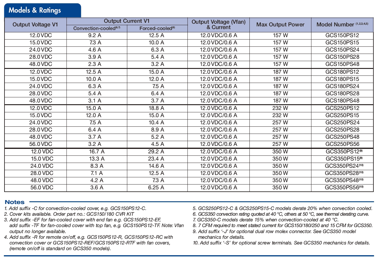 Products Medically Approved Power Supplies Medically Approved Power Supplies AC-DC Converter GCS150 to 350 Series Features Convection/Forced-cooled Ratings Universal 85 - 264 VAC Input IT & Medical Safety Approvals (Class I & II) < 0.5 W Standby Power (150 & 180 Models) -40° C to +70° C Operation Remote On/Off Class B Emissions 3 Year Warranty The GCS Series has been designed to minimise the no load power consumption and maximise efficiency in order to facilitate equipment design to the latest environmental legislation. Approved for Class I and Class II applications, this range of single output AC-DC power supplies are packaged in an industry standard 3.0" x 5.0" x 1.42" package and achieves EN55011/32 Level B emissions compliance whilst maintaining very low earth leakage currents, making them suitable for a wide range of 1U and other industrial, IT and medical applications.The series has single output versions from 12 V to 56 VDC, dual-fusing for compliance withIEC60601-1 and feature minimal excess heat generation as efficiencies reach 94%. They will deliver up to 350 W of power over an operatingrange of -40 °C and up to +70 °C and are available with a number of cover options. PDF Please write down your comment on this product, and click Add to Inquiry List for inquiry Add to Inquiry List Review Inquiry List Back
