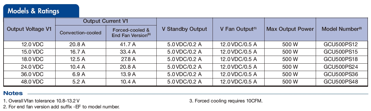 Products Medically Approved Power Supplies Medically Approved Power Supplies AC-DC Converter GCU500 Series Features 250 W Convection & 500 W Forced-cooled Ratings 5 V Standby Output Universal 80 - 264 VAC Input IT & Medical Safety Approvals -40° C to +70° C Operation Power Fail, Remote On/Off & Remote Sense Class B Emissions 3 Year Warranty The GCU500 is packaged in a 3.3" x 6.5" x 1.55" package and achieves EN55011/32Level B conducted emissions compliance whilst maintaining very low earth leakagecurrents, making it suitable for a wide range of 1U and other industrial, IT and medicalapplications.The series has single output versions from 12 V to 48 VDC, dual-fusing for compliance withIEC60601-1 and features minimal waste heat as efficiencies reach 93%. The GCU500 delivers up to 500 W of power over an operating range of-40 °C to +70 °C and offers remote on/off control and power fail signal along with 5 V standby and fan supplies. PDF Please write down your comment on this product, and click Add to Inquiry List for inquiry Add to Inquiry List Review Inquiry List Back